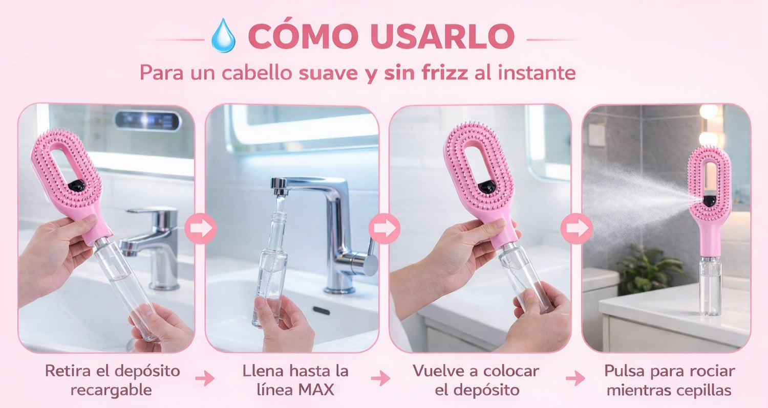 La Styra™ es el primer cepillo con spray integrado que hidrata y desenreda al mismo tiempo. Con solo presionar el botón, libera una fina neblina de agua o tu producto favorito mientras peinas — dejando el cabello más suave, brillante y sin frizz en minutos.
